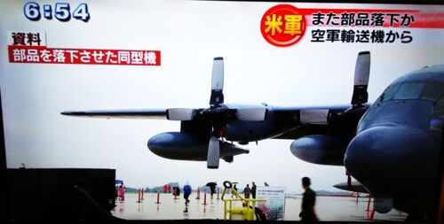 2019/10/22 沖縄タイムス 嘉手納基地米軍機が部品落下、重さ3.6kg 18日午前5時40分ごろ 嘉手納基地で落下物の発覚 18日午後9時45分ごろ 防衛局から県へ第一報のメール 19日午後1時ごろ 防衛局から県へ第二報のメール 21日夕方 県が公表 21…